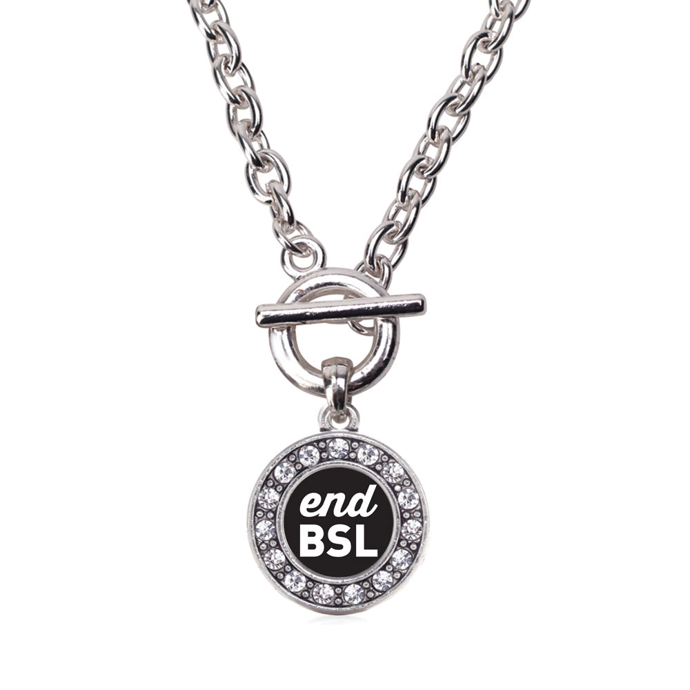Our sparkling toggle necklace, equipped with a stylish toggle clasp and the End BSL circle charm, is crafted from white metal with a silver plated finish and accented with cubic zirconia stones.