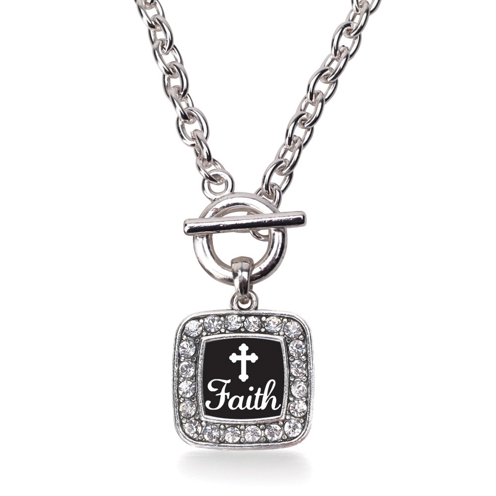 Our sparkling toggle necklace, equipped with a stylish toggle clasp and the Faith square charm, is crafted from white metal with a silver plated finish and accented with cubic zirconia stones.