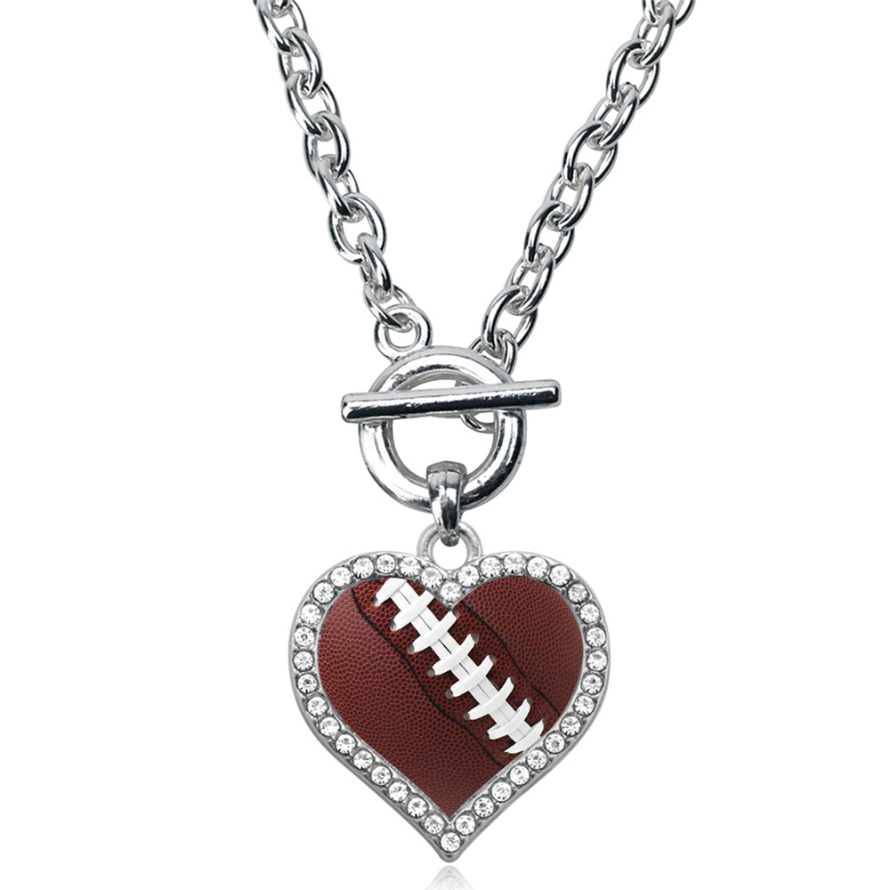 Our sparkling toggle necklace, equipped with a stylish toggle clasp and the Football open heart charm, is crafted from white metal with a silver plated finish and accented with cubic zirconia stones.