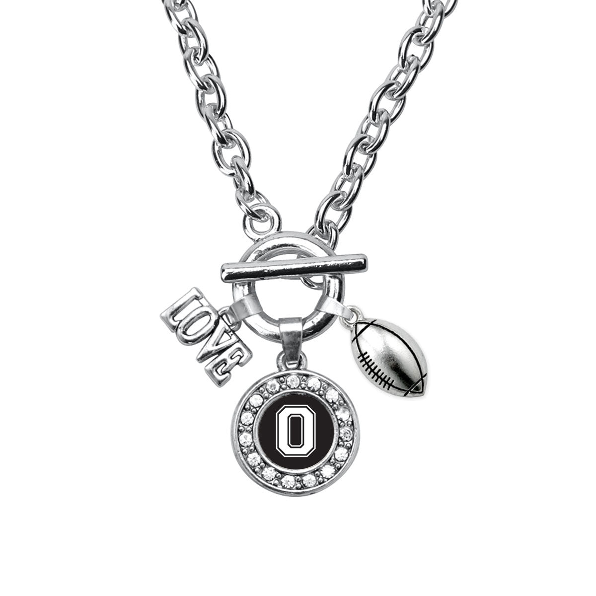Our sparkling toggle necklace, equipped with a stylish toggle clasp and the Football - Sports Initial O circle charm, is crafted from white metal with a silver plated finish and accented with cubic zirconia stones.