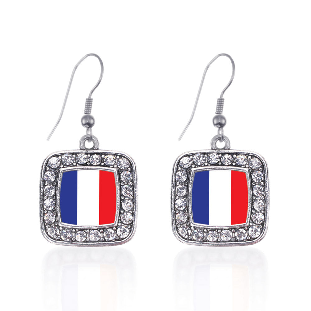 Our sparkling dangle earrings, equipped with a stylish french hook backing and the France Flag square charm, is crafted from white metal with a silver plated finish and accented with cubic zirconia stones.