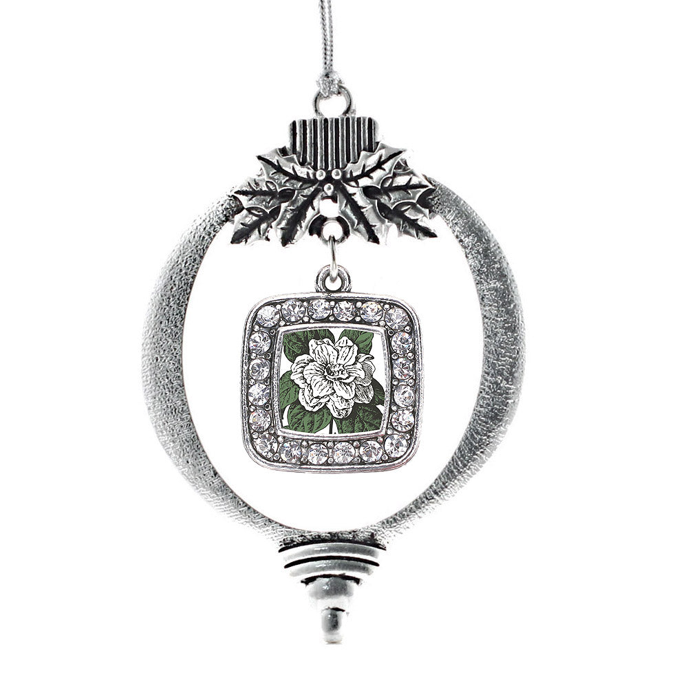 Our sparkling holiday ornament, equipped with a stylish silver rope and the Gardenia Flower square charm, is crafted from white metal with a silver plated finish and accented with cubic zirconia stones.