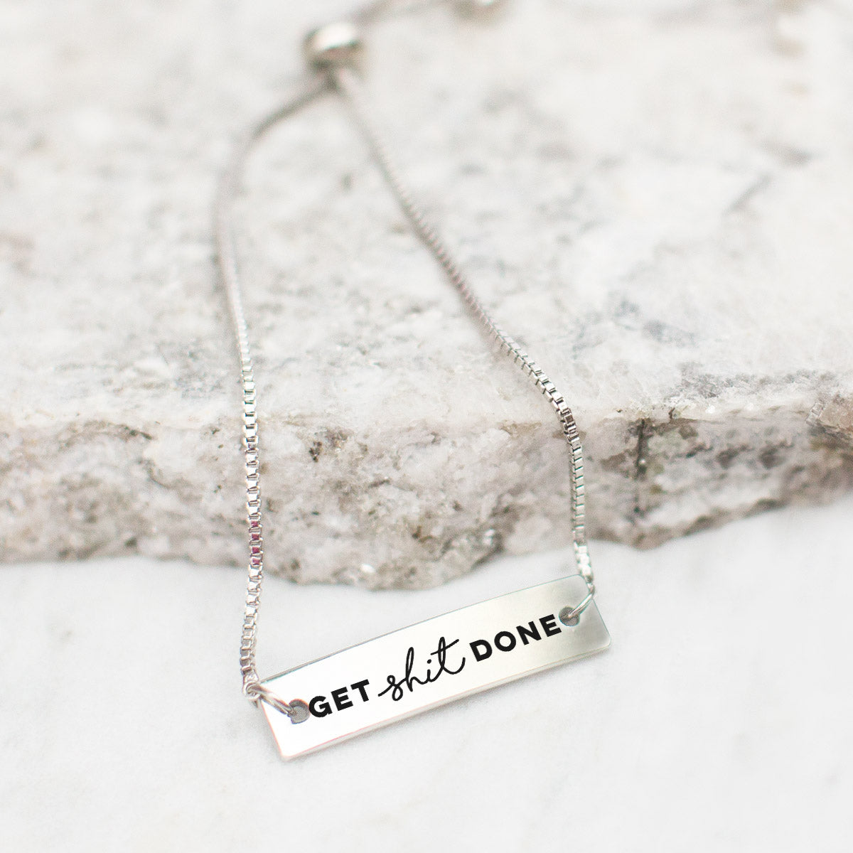 Our sparkling adjustable bar bracelet, equipped with a stylish beaded clasp and the Get Shit Done bar charm, is crafted from white metal with a silver plated finish.