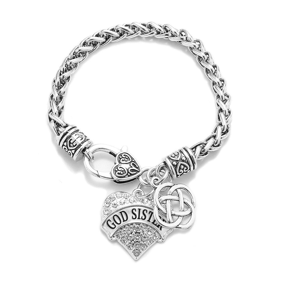 Our sparkling braided bracelet, equipped with a stylish lobster claw clasp and the God Sister Celtic Knot pave heart charm, is crafted from white metal with a silver plated finish and accented with cubic zirconia stones.