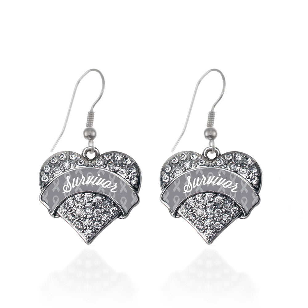 Silver Gray Survivor Pave Heart Charm Dangle Earrings