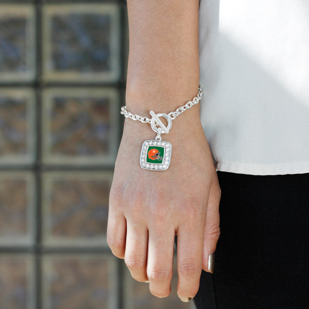 Our sparkling toggle bracelet, equipped with a stylish toggle clasp and the Green and Orange Team Helmet square charm, is crafted from white metal with a silver plated finish and accented with cubic zirconia stones.