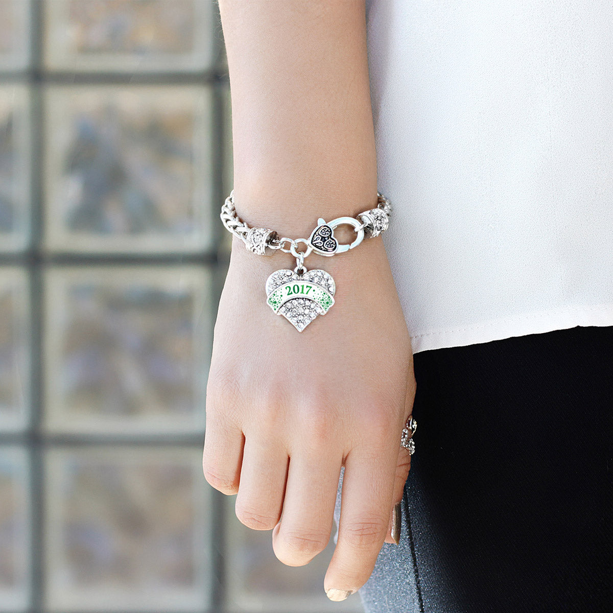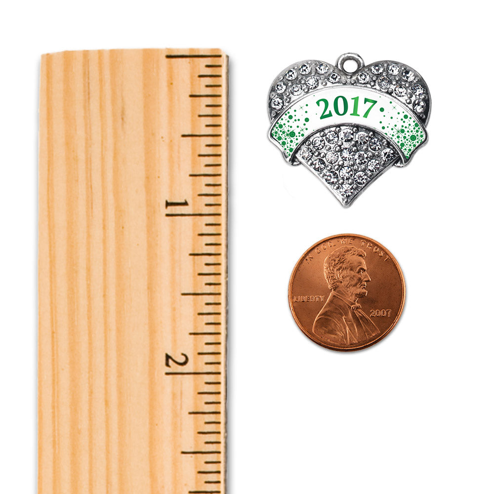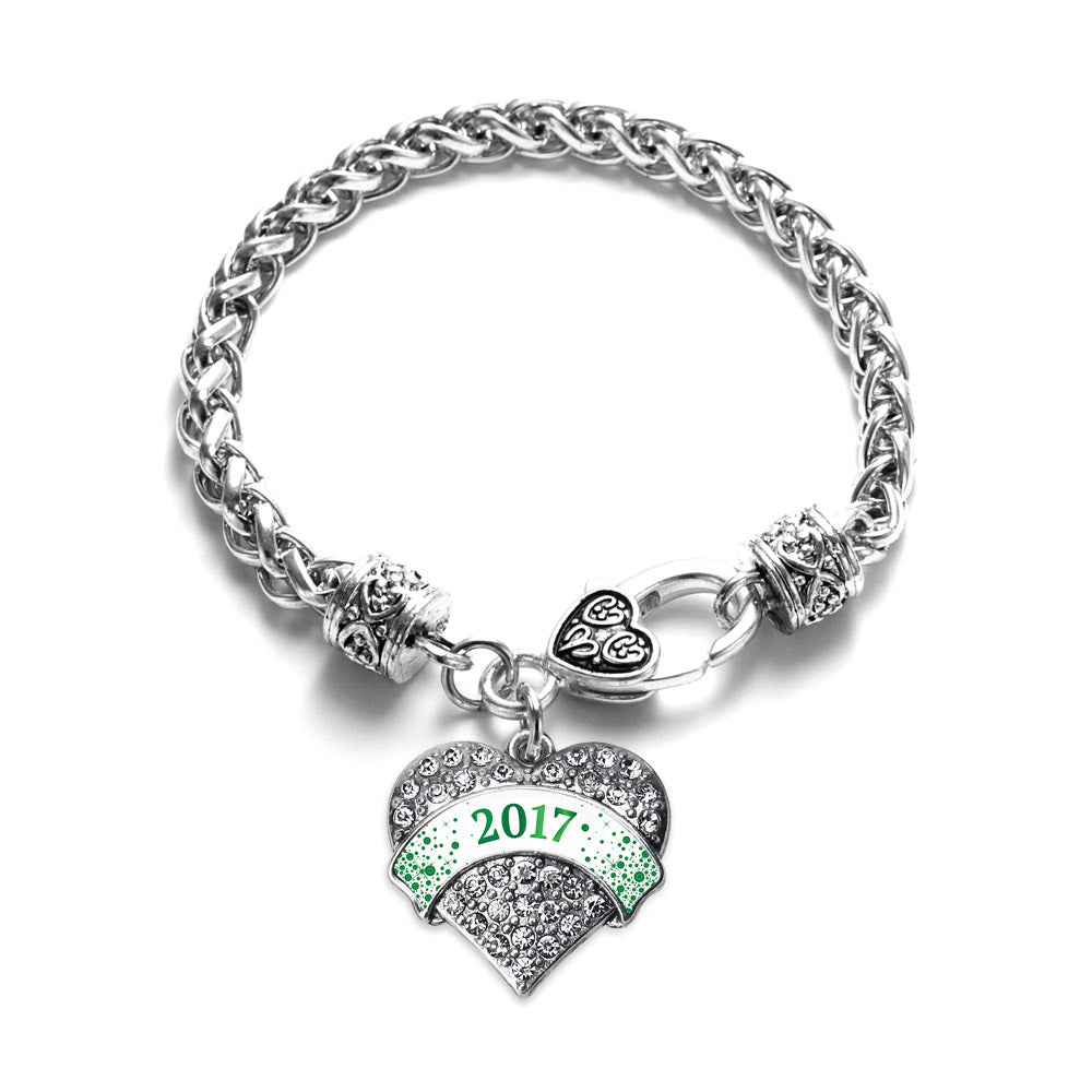 Our sparkling braided bracelet, equipped with a stylish lobster claw clasp and the Green and White Christmas 2017 pave heart charm, is crafted from white metal with a silver plated finish and accented with cubic zirconia stones.