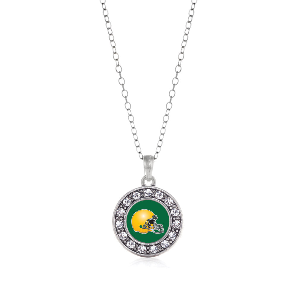 Our sparkling classic necklace, equipped with a stylish lobster claw clasp and the Green and Yellow Team Helmet circle charm, is crafted from white metal with a silver plated finish and accented with cubic zirconia stones.