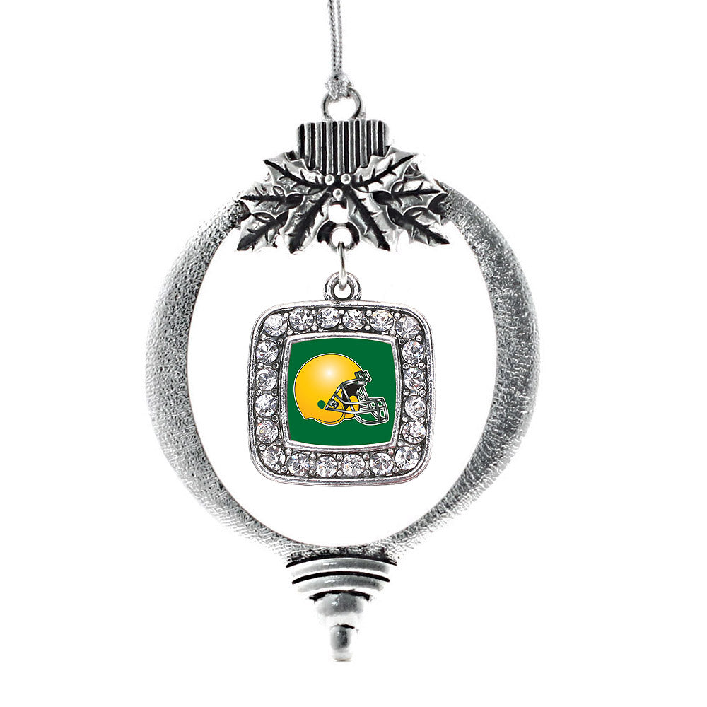 Our sparkling holiday ornament, equipped with a stylish silver rope and the Green and Yellow Team Helmet square charm, is crafted from white metal with a silver plated finish and accented with cubic zirconia stones.
