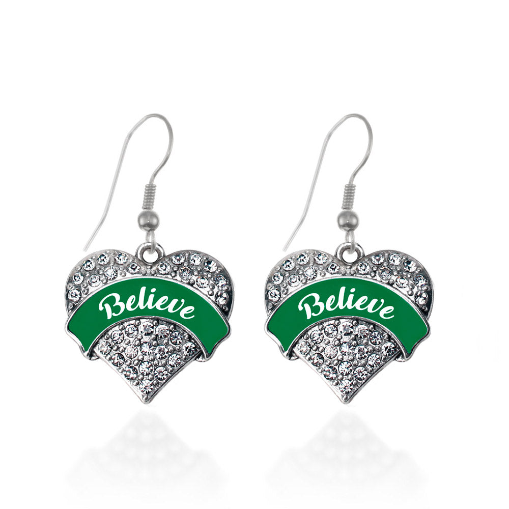 Silver Green Believe Pave Heart Charm Dangle Earrings