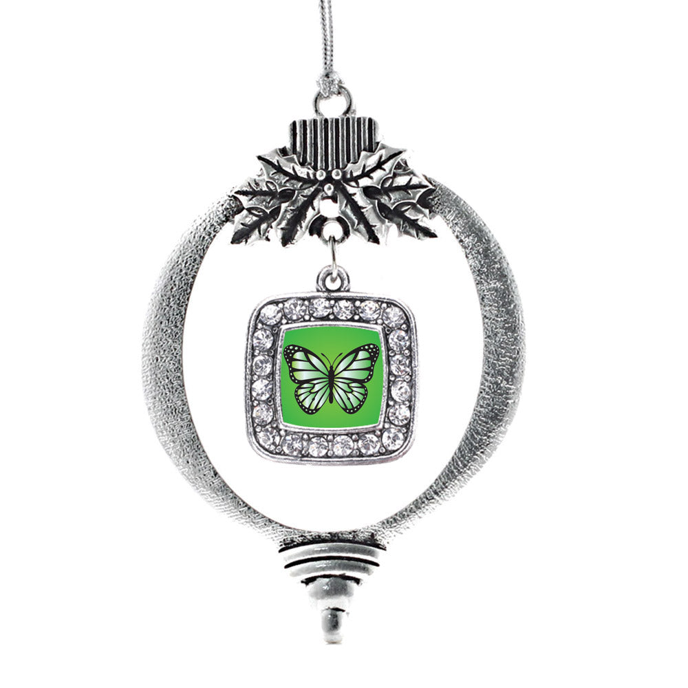 Our sparkling holiday ornament, equipped with a stylish silver rope and the Green Butterfly square charm, is crafted from white metal with a silver plated finish and accented with cubic zirconia stones.