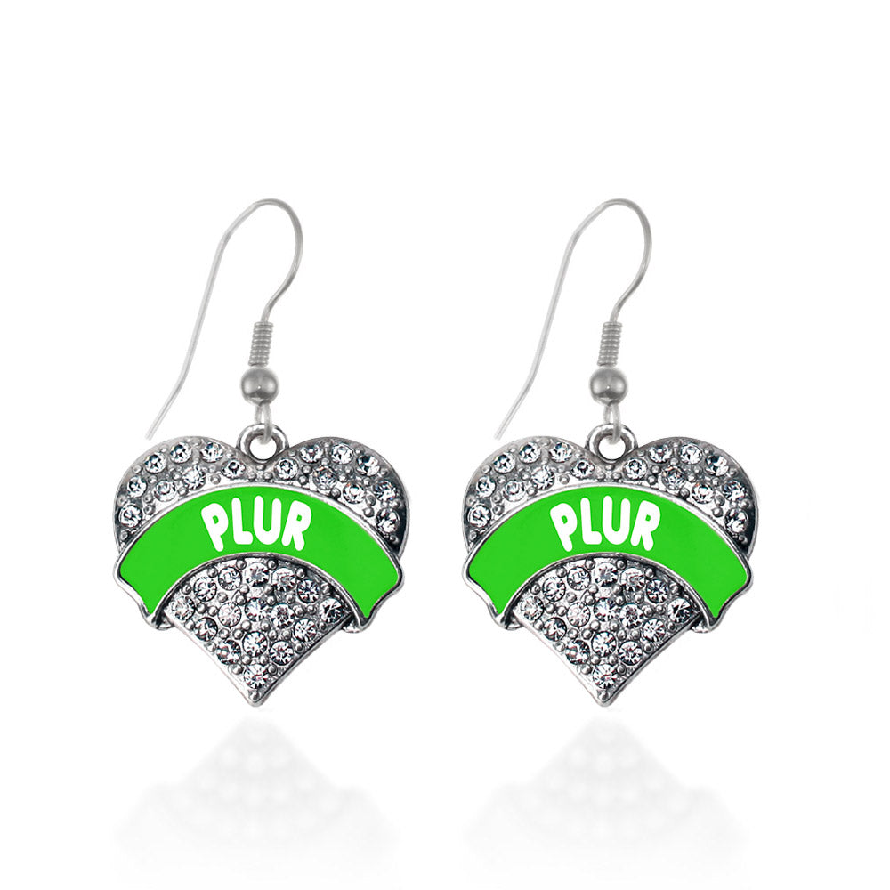 Silver Green PLUR Pave Heart Charm Dangle Earrings