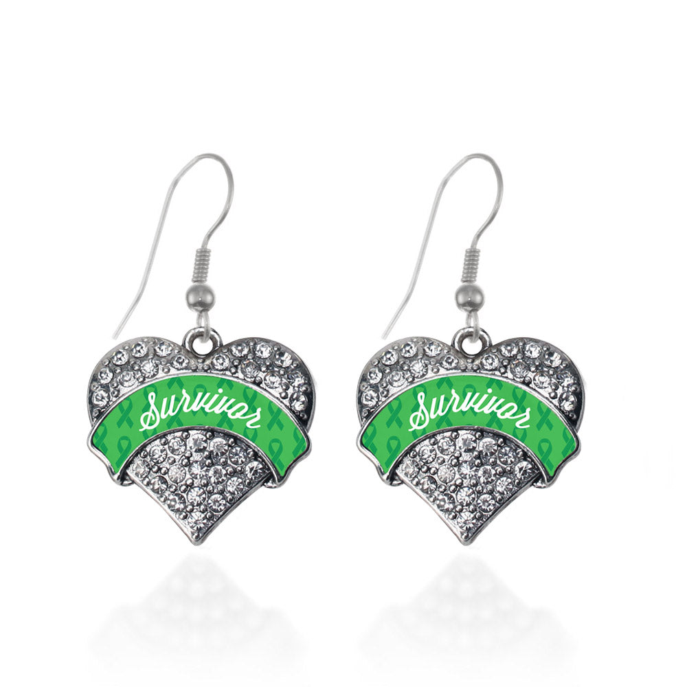 Silver Green Survivor Pave Heart Charm Dangle Earrings