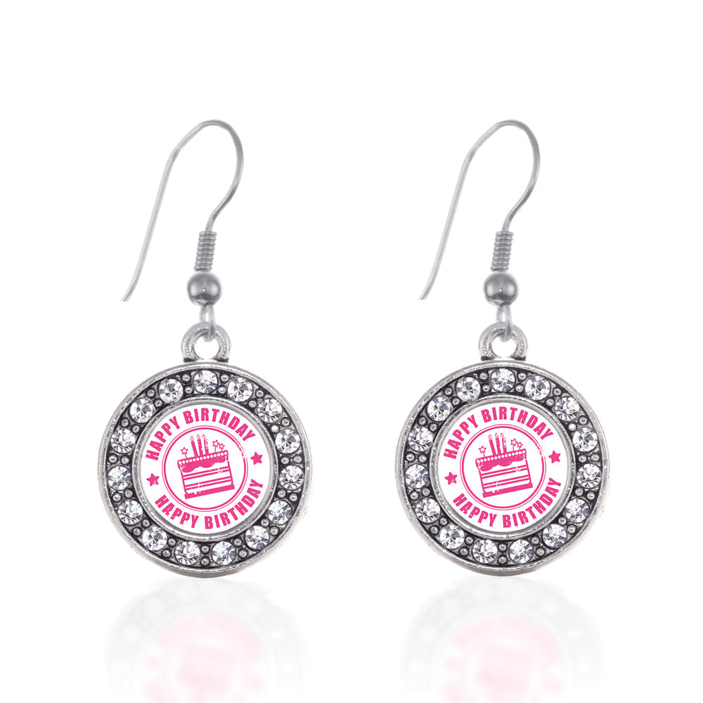 Silver Happy Birthday Circle Charm Dangle Earrings