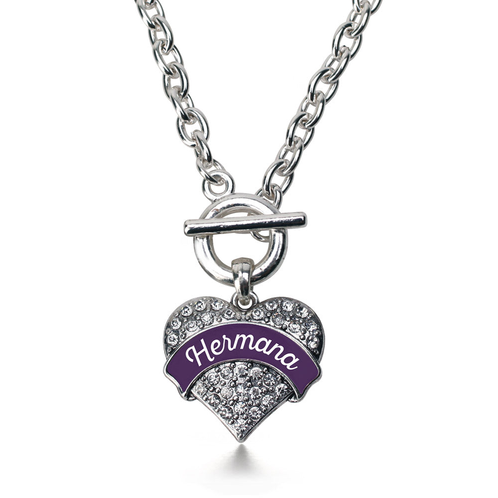 Our sparkling toggle necklace, equipped with a stylish toggle clasp and the Hermana - Plum pave heart charm, is crafted from white metal with a silver plated finish and accented with cubic zirconia stones.