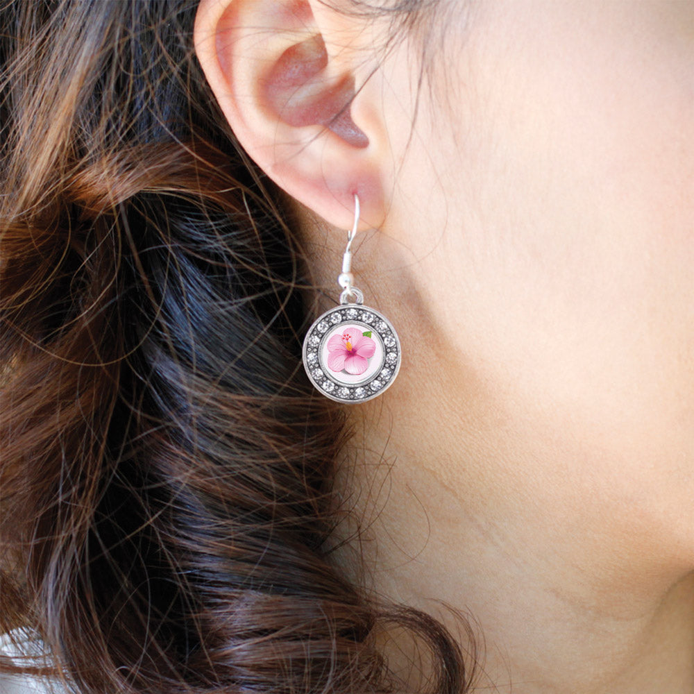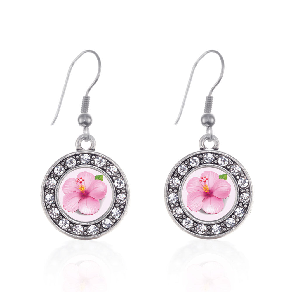 Silver Hibiscus Flower Circle Charm Dangle Earrings