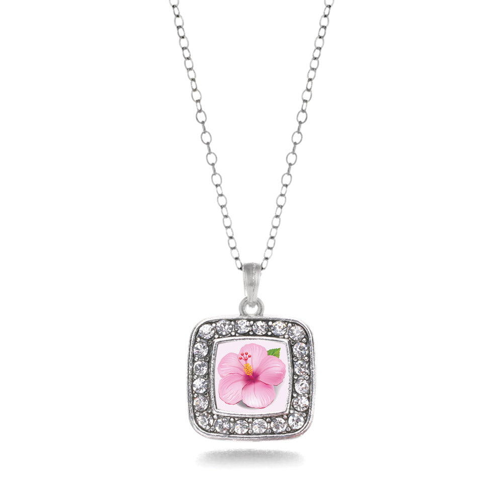 Silver Hibiscus Flower Square Charm Classic Necklace