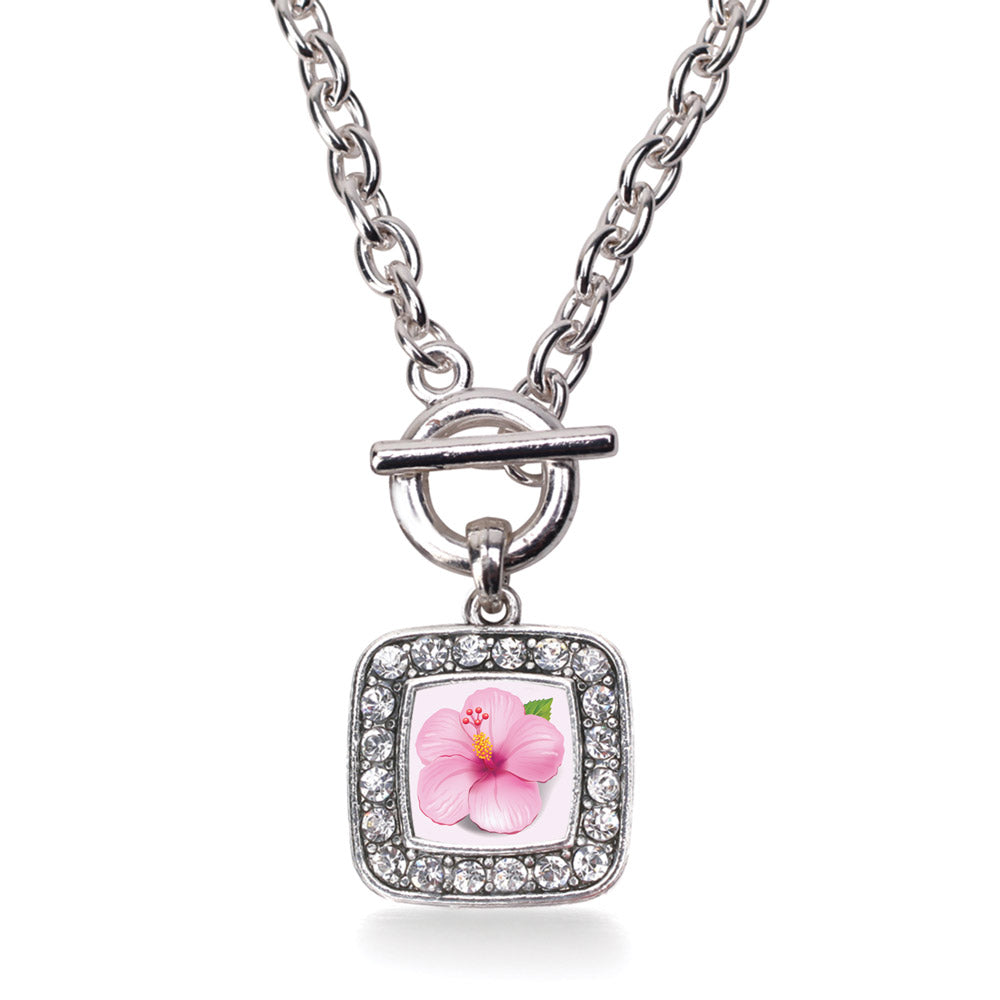 Silver Hibiscus Flower Square Charm Toggle Necklace