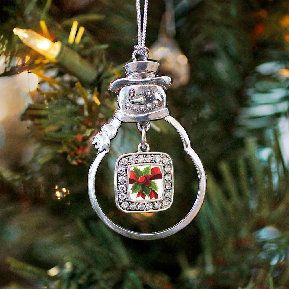 Our sparkling snowman ornament, equipped with a stylish silver rope and the Holly Plant square charm, is crafted from white metal with a silver plated finish and accented with cubic zirconia stones.
