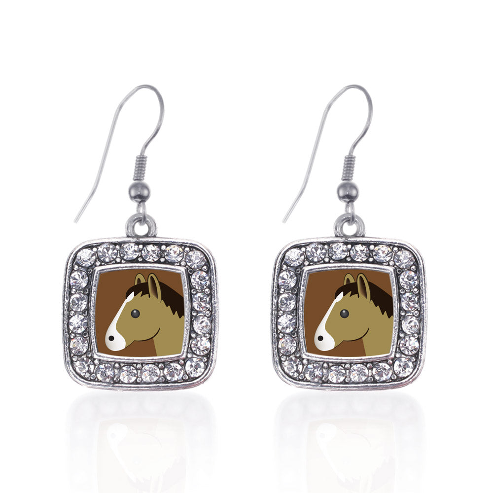 Our sparkling dangle earrings, equipped with a stylish french hook backing and the Horse Emoji square charm, is crafted from white metal with a silver plated finish and accented with cubic zirconia stones.