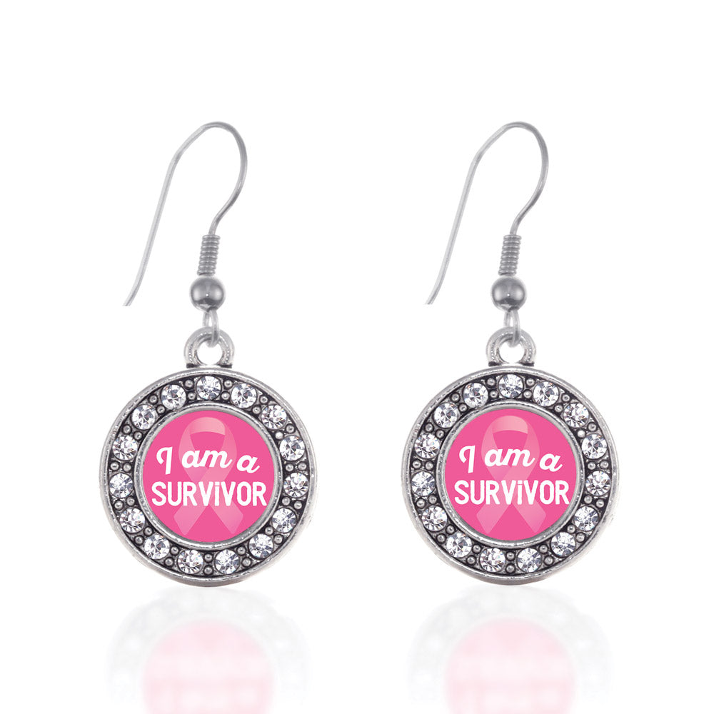 Silver I am a Survivor Breast Cancer Awareness Circle Charm Dangle Earrings