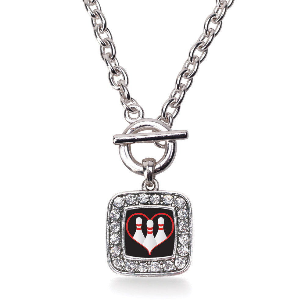Our sparkling toggle necklace, equipped with a stylish toggle clasp and the I Heart Bowling square charm, is crafted from white metal with a silver plated finish and accented with cubic zirconia stones.