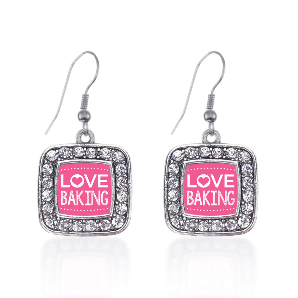Our sparkling dangle earrings, equipped with a stylish french hook backing and the I Love Baking square charm, is crafted from white metal with a silver plated finish and accented with cubic zirconia stones.