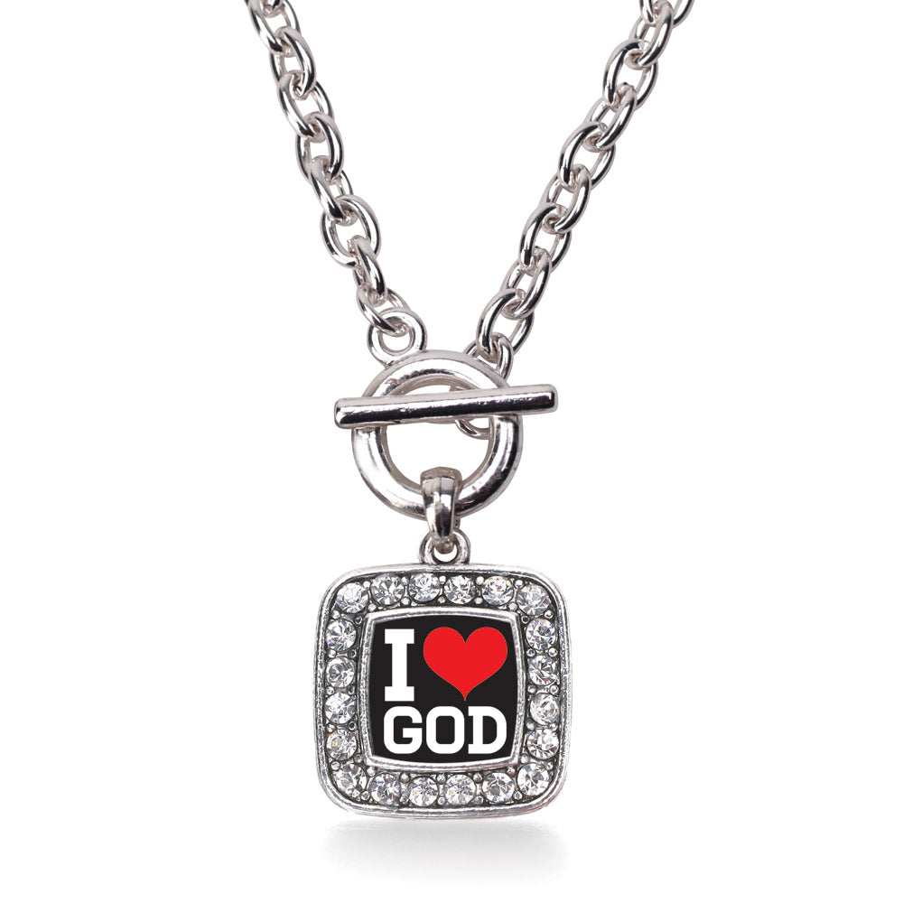 Our sparkling toggle necklace, equipped with a stylish toggle clasp and the I Love God square charm, is crafted from white metal with a silver plated finish and accented with cubic zirconia stones.