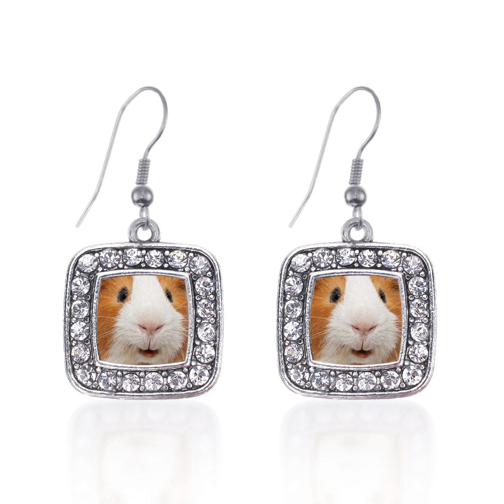 Our sparkling dangle earrings, equipped with a stylish french hook backing and the I Love Guinea Pigs square charm, is crafted from white metal with a silver plated finish and accented with cubic zirconia stones.