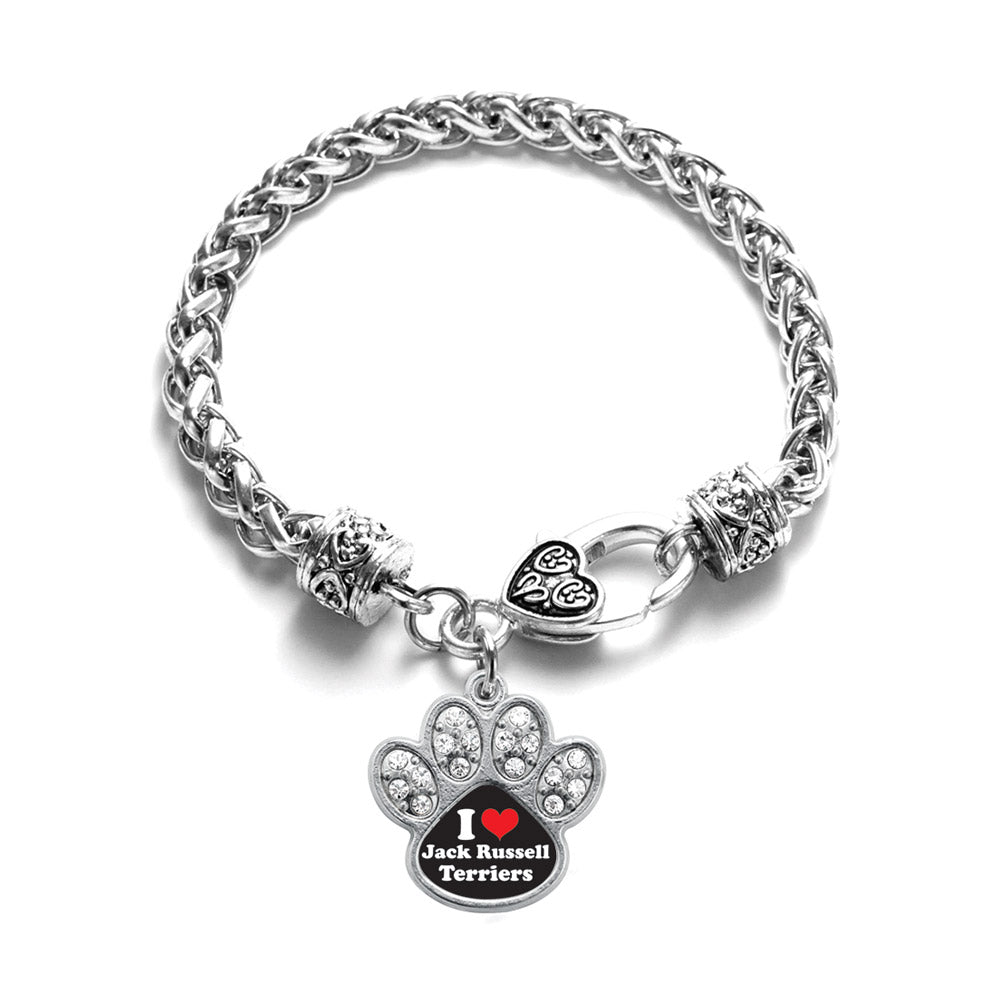 Our sparkling braided bracelet, equipped with a stylish lobster claw clasp and the I Love Jack Russell Terriers pave paw charm, is crafted from white metal with a silver plated finish and accented with cubic zirconia stones.