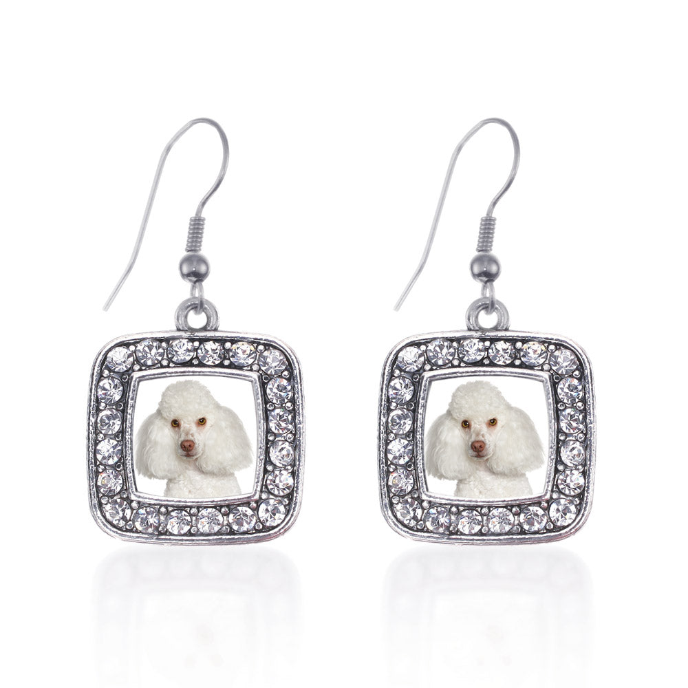 Our sparkling dangle earrings, equipped with a stylish french hook backing and the I Love My Poodle square charm, is crafted from white metal with a silver plated finish and accented with cubic zirconia stones.