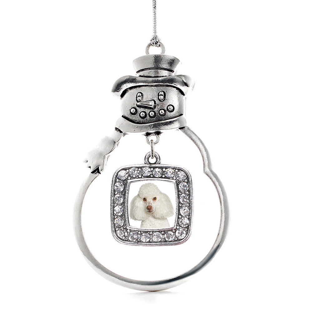 Our sparkling snowman ornament, equipped with a stylish silver rope and the I Love My Poodle square charm, is crafted from white metal with a silver plated finish and accented with cubic zirconia stones.