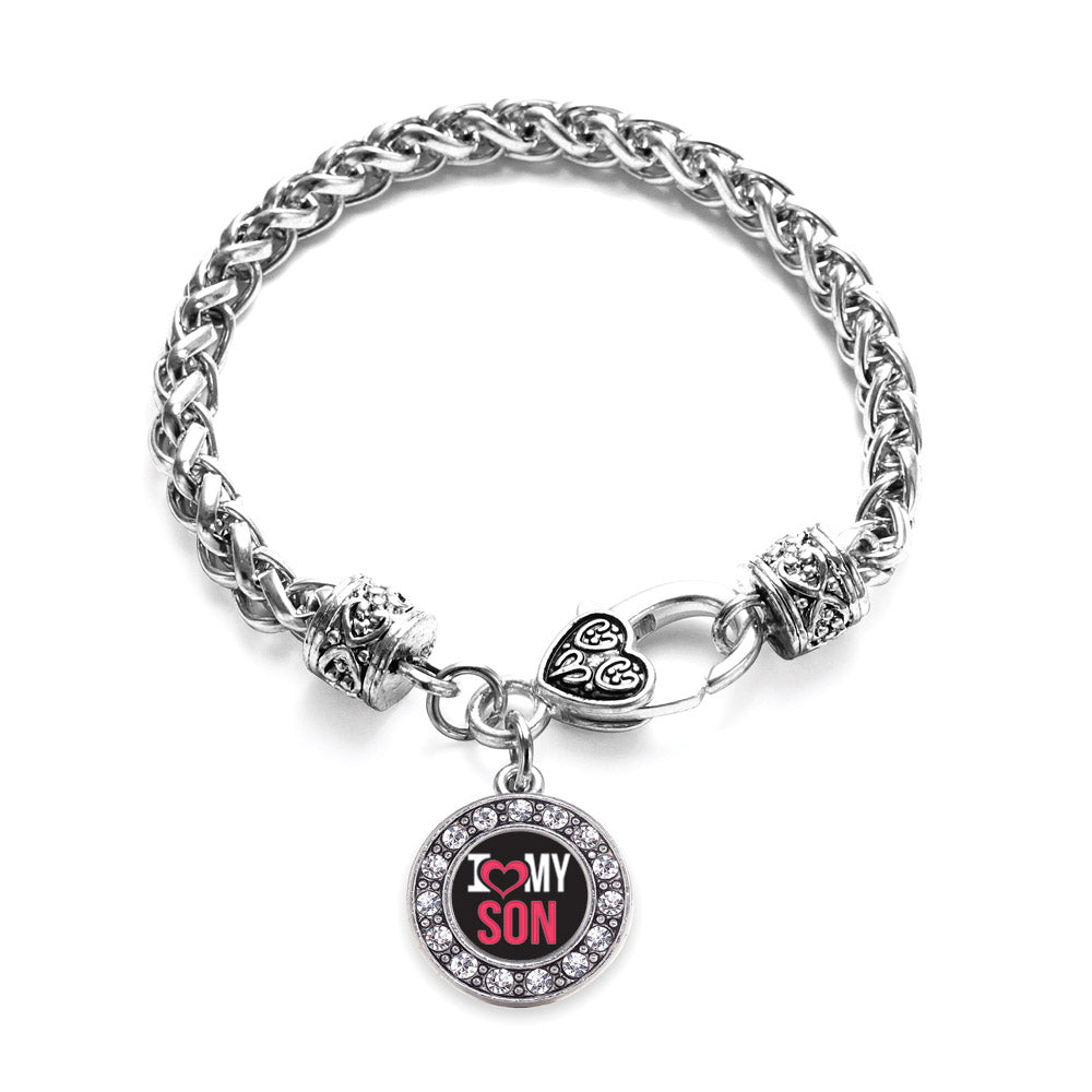 Our sparkling braided bracelet, equipped with a stylish lobster claw clasp and the I Love My Son circle charm, is crafted from white metal with a silver plated finish and accented with cubic zirconia stones.