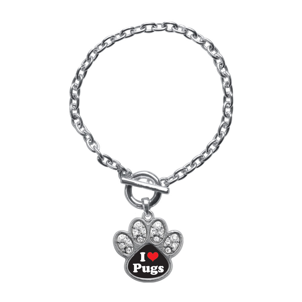 Silver I Love Pugs Pave Paw Charm Toggle Bracelet