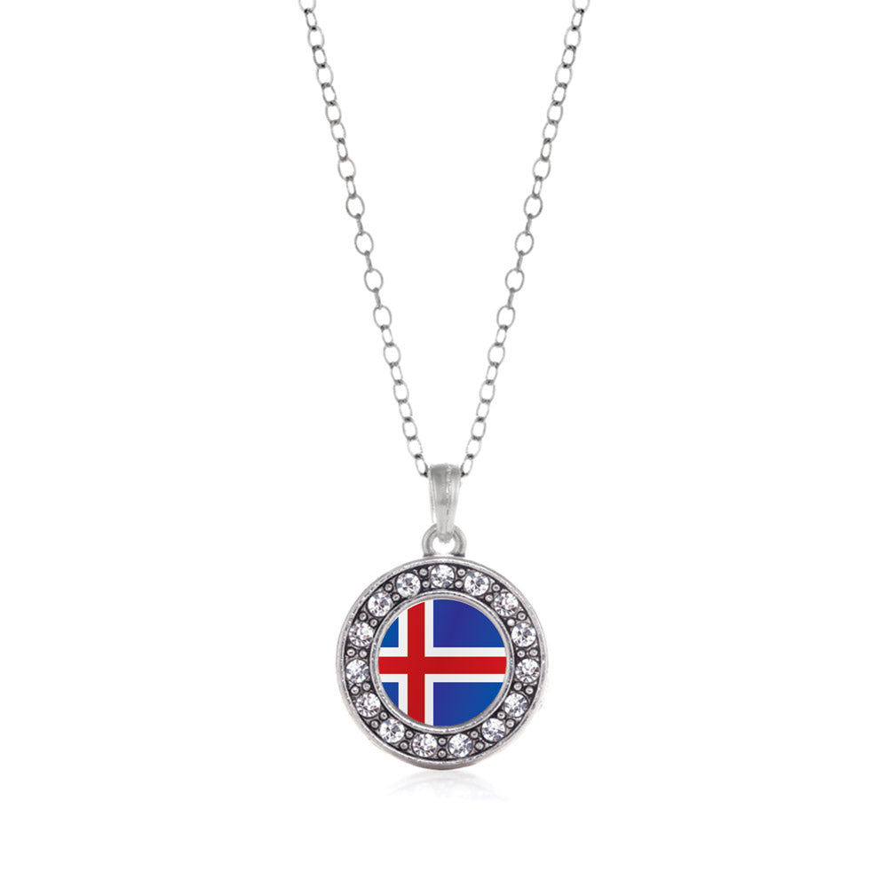 Our sparkling classic necklace, equipped with a stylish lobster claw clasp and the Iceland Flag circle charm, is crafted from white metal with a silver plated finish and accented with cubic zirconia stones.