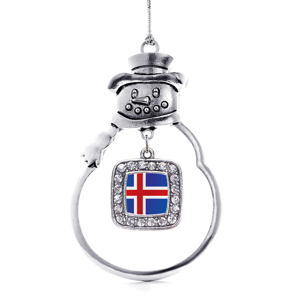 Our sparkling snowman ornament, equipped with a stylish silver rope and the Iceland Flag square charm, is crafted from white metal with a silver plated finish and accented with cubic zirconia stones.