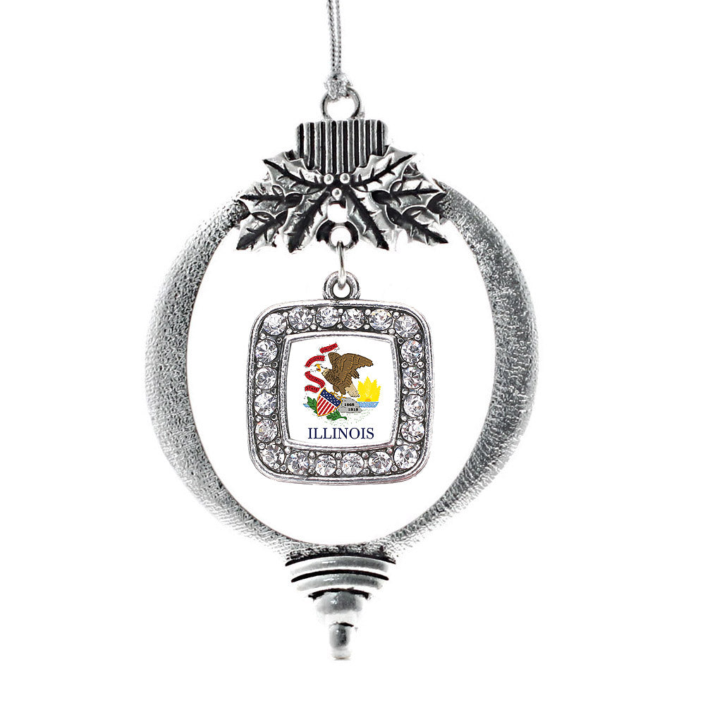 Our sparkling holiday ornament, equipped with a stylish silver rope and the Illinois Flag square charm, is crafted from white metal with a silver plated finish and accented with cubic zirconia stones.