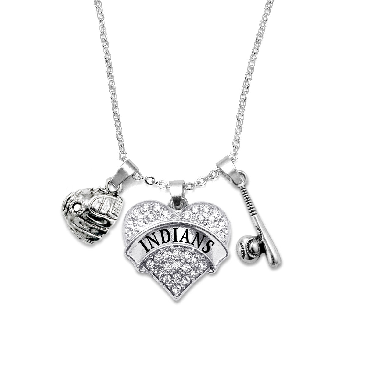 Our sparkling classic necklace, equipped with a stylish lobster claw clasp and the Indians Baseball Bat and Glove pave heart charm, is crafted from white metal with a silver plated finish and accented with cubic zirconia stones.