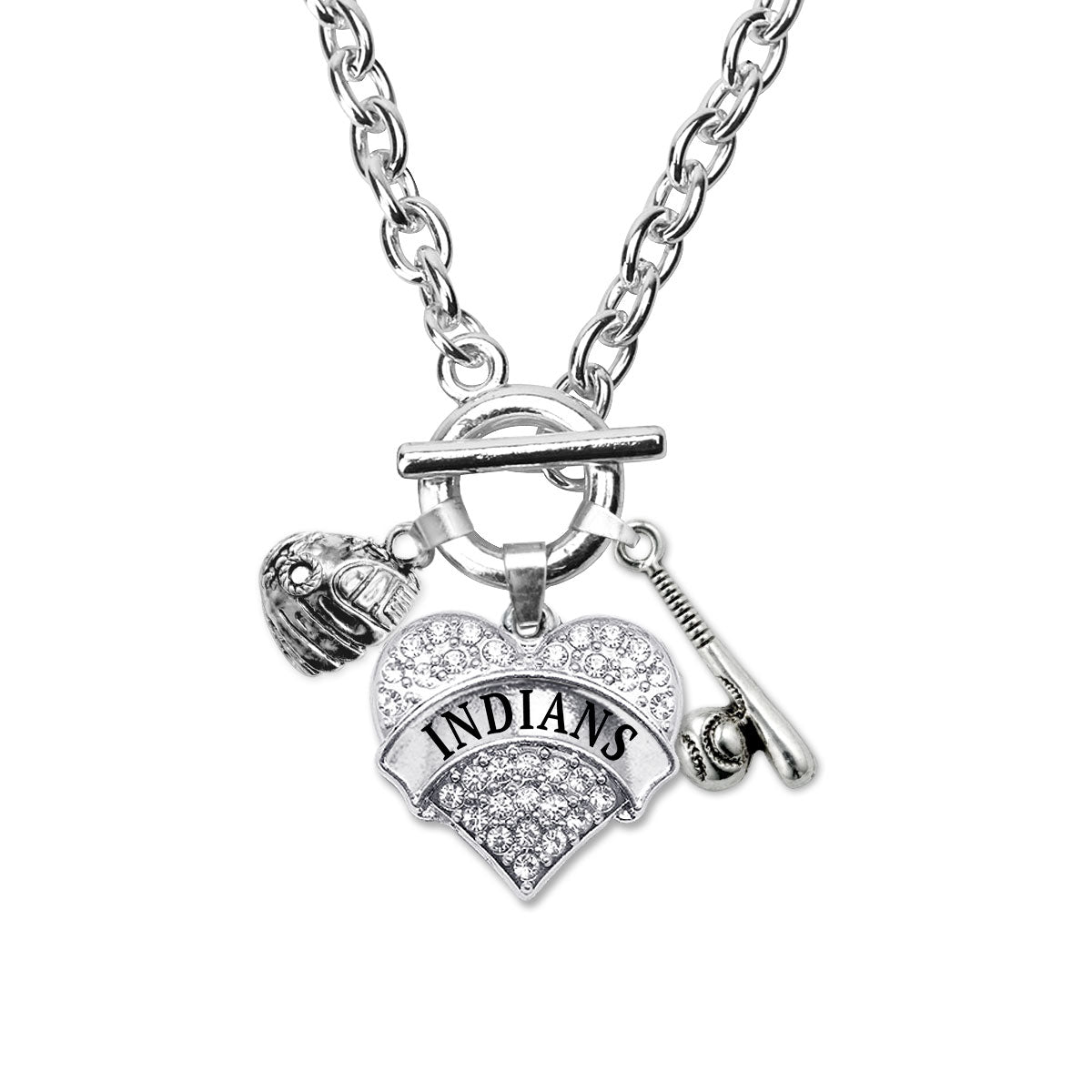 Our sparkling toggle necklace, equipped with a stylish toggle clasp and the Indians Baseball Bat and Glove pave heart charm, is crafted from white metal with a silver plated finish and accented with cubic zirconia stones.
