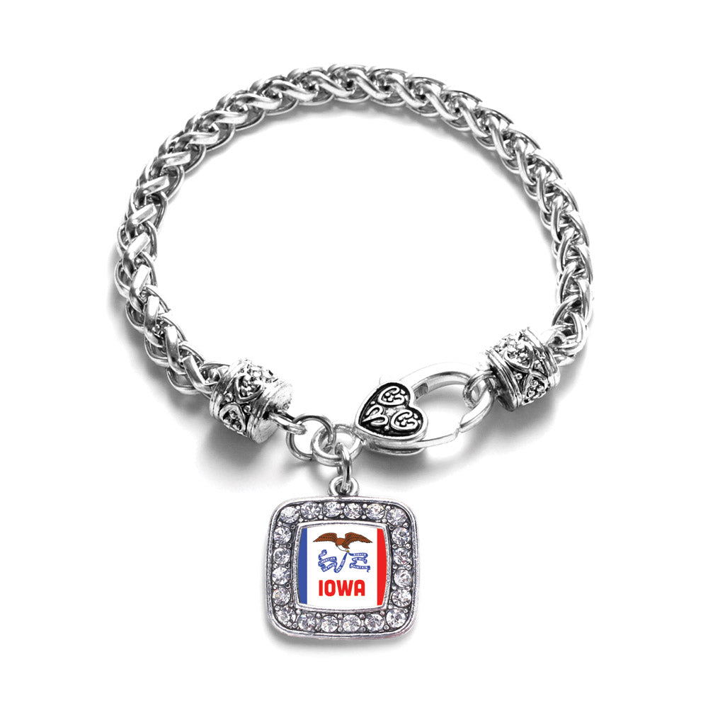 Our sparkling braided bracelet, equipped with a stylish lobster claw clasp and the Iowa Flag square charm, is crafted from white metal with a silver plated finish and accented with cubic zirconia stones.
