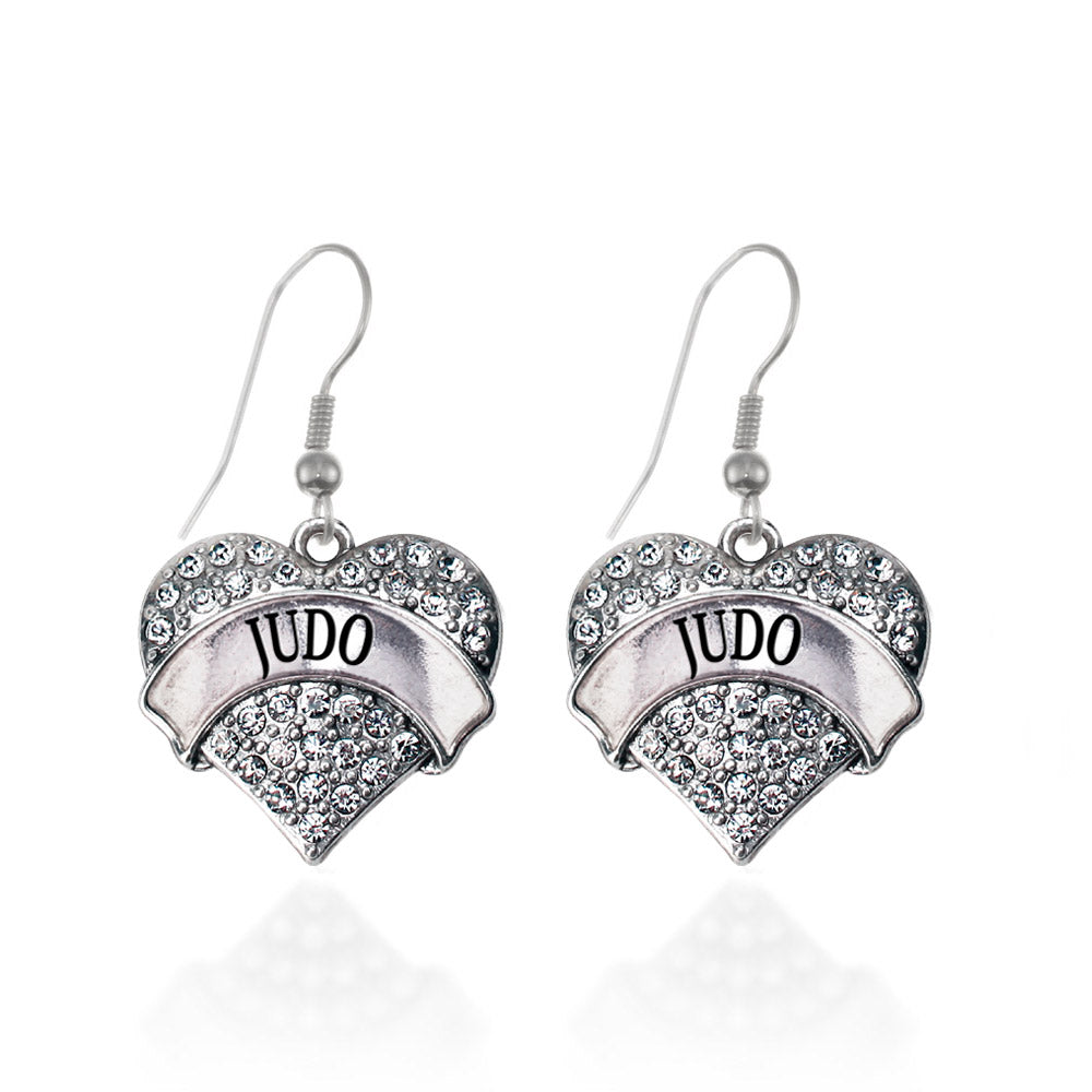 Our sparkling dangle earrings, equipped with a stylish french hook backing and the Judo pave heart charm, is crafted from white metal with a silver plated finish and accented with cubic zirconia stones.