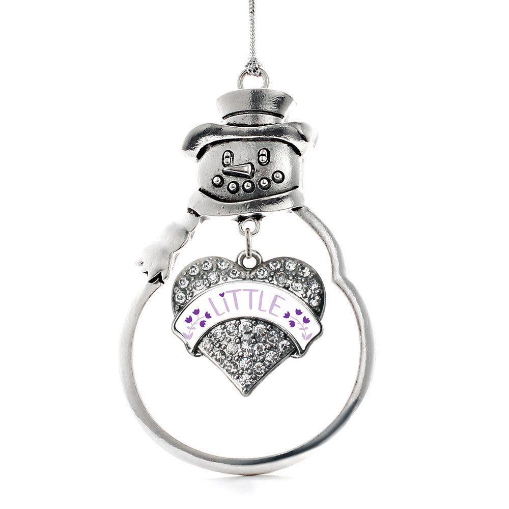 Our sparkling snowman ornament, equipped with a stylish silver rope and the Lavender and Royal Purple Little pave heart charm, is crafted from white metal with a silver plated finish and accented with cubic zirconia stones.
