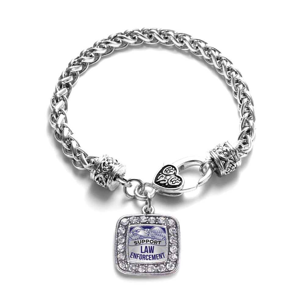 Our sparkling braided bracelet, equipped with a stylish lobster claw clasp and the Law Enforcement Support square charm, is crafted from white metal with a silver plated finish and accented with cubic zirconia stones.