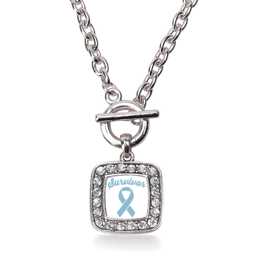 Our sparkling toggle necklace, equipped with a stylish toggle clasp and the Light Blue Ribbon Survivor square charm, is crafted from white metal with a silver plated finish and accented with cubic zirconia stones.