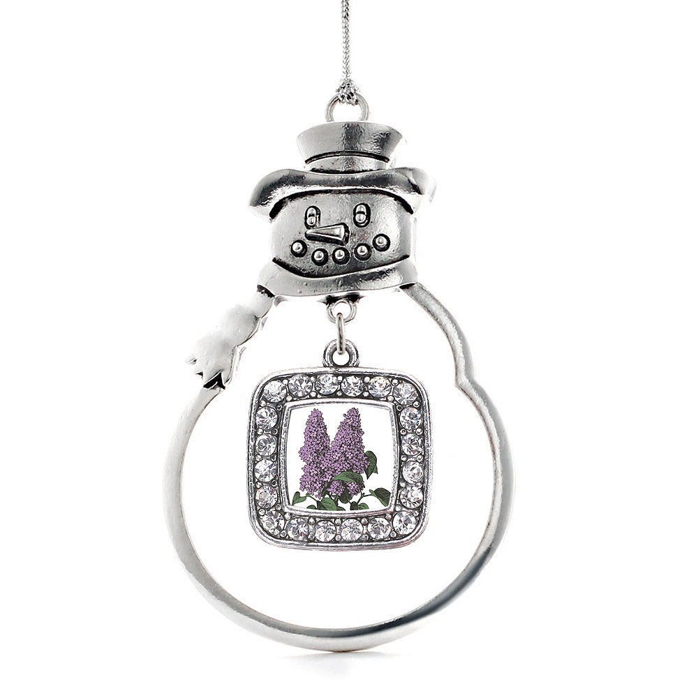 Our sparkling snowman ornament, equipped with a stylish silver rope and the Lilac Flower square charm, is crafted from white metal with a silver plated finish and accented with cubic zirconia stones.