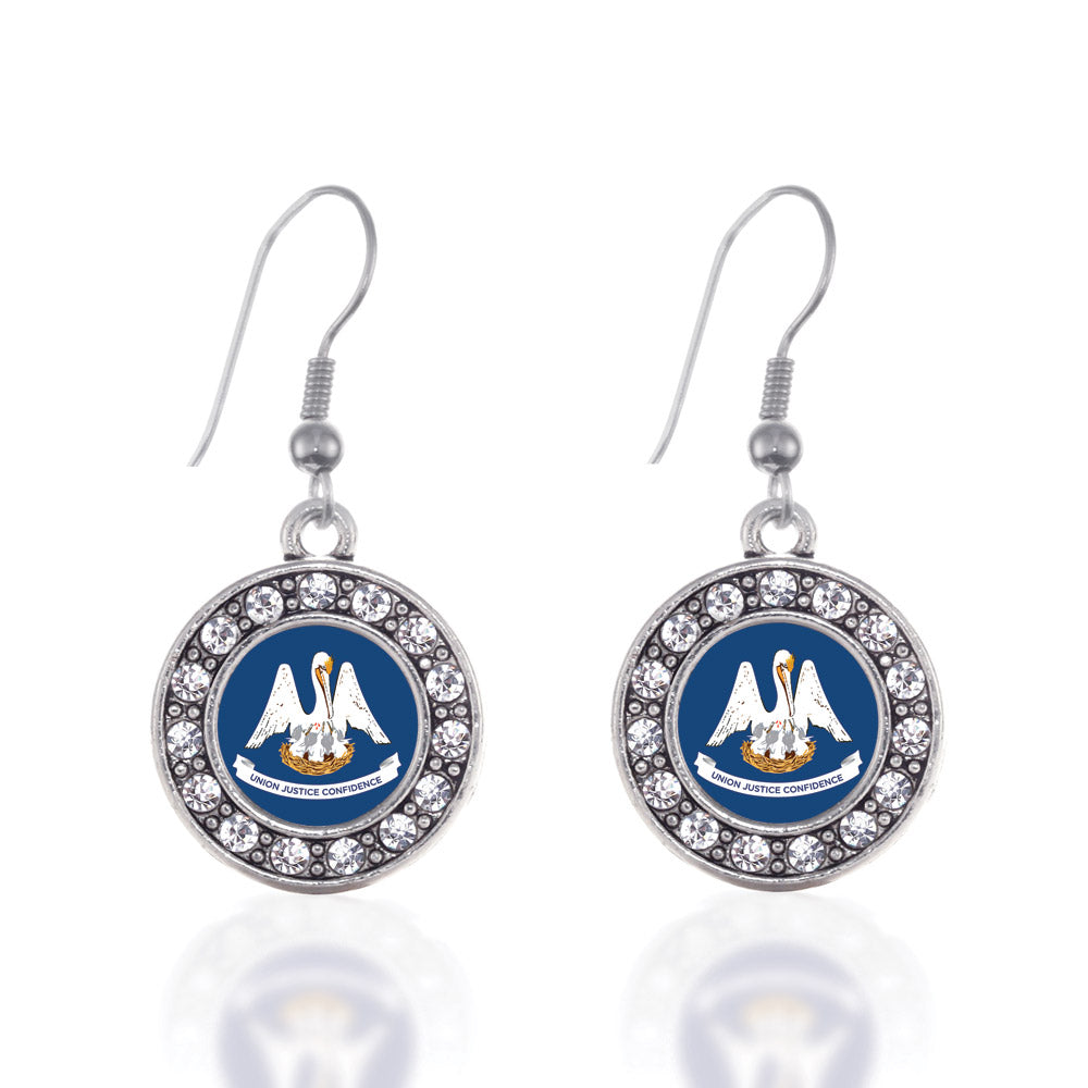 Our sparkling dangle earrings, equipped with a stylish french hook backing and the Louisiana Flag circle charm, is crafted from white metal with a silver plated finish and accented with cubic zirconia stones.
