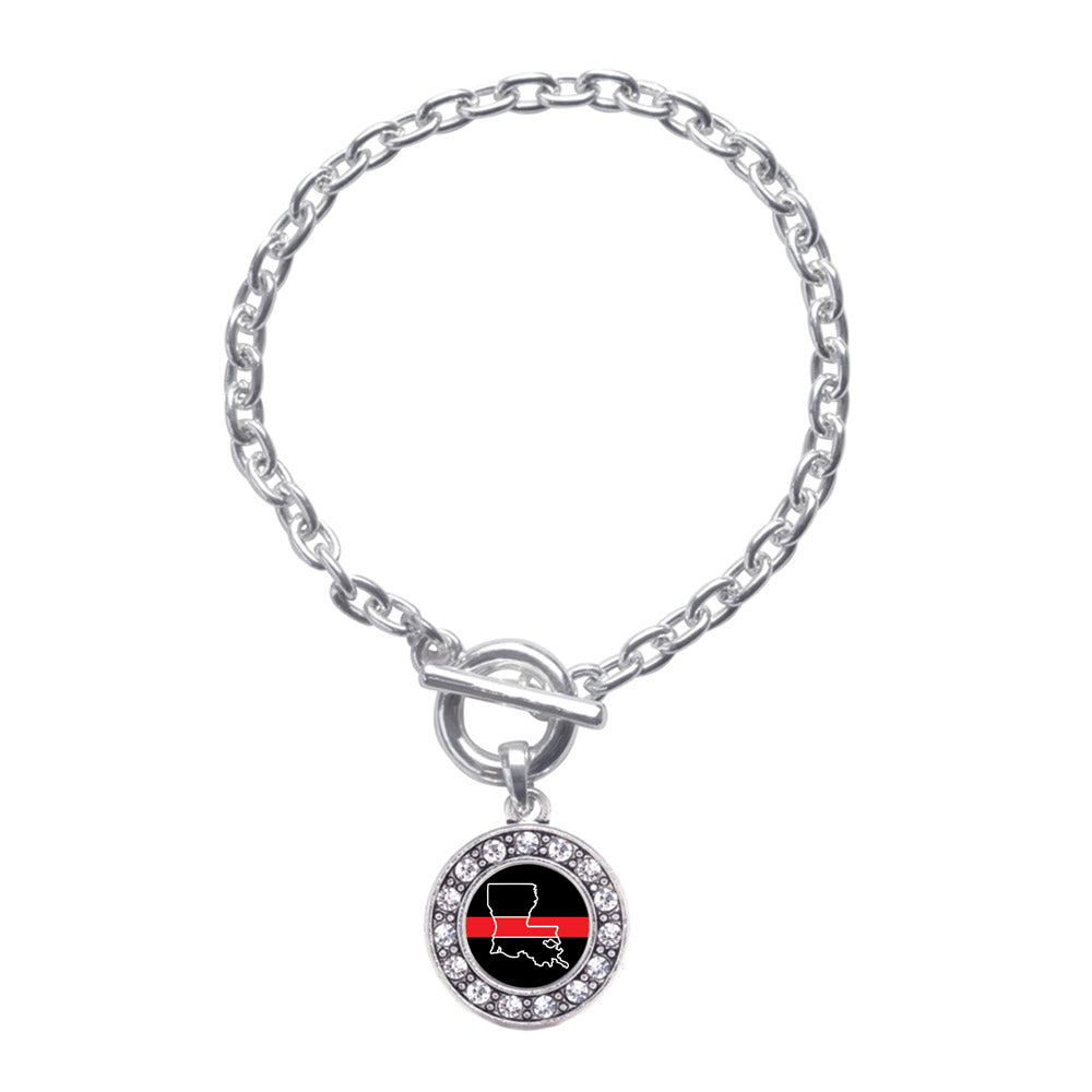 Our sparkling toggle bracelet, equipped with a stylish toggle clasp and the Louisiana Thin Red Line circle charm, is crafted from white metal with a silver plated finish and accented with cubic zirconia stones.