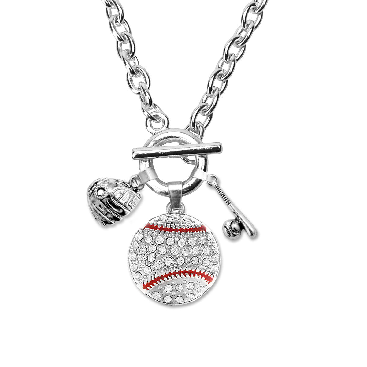 Our sparkling toggle necklace, equipped with a stylish toggle clasp and the Love Baseball Bat and Glove charm, is crafted from white metal with a silver plated finish.