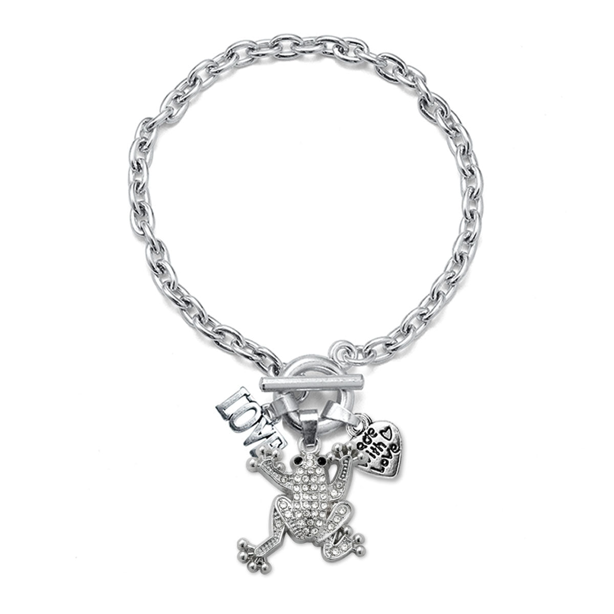 Our sparkling toggle bracelet, equipped with a stylish toggle clasp and the Love Frog charm, is crafted from white metal with a silver plated finish.