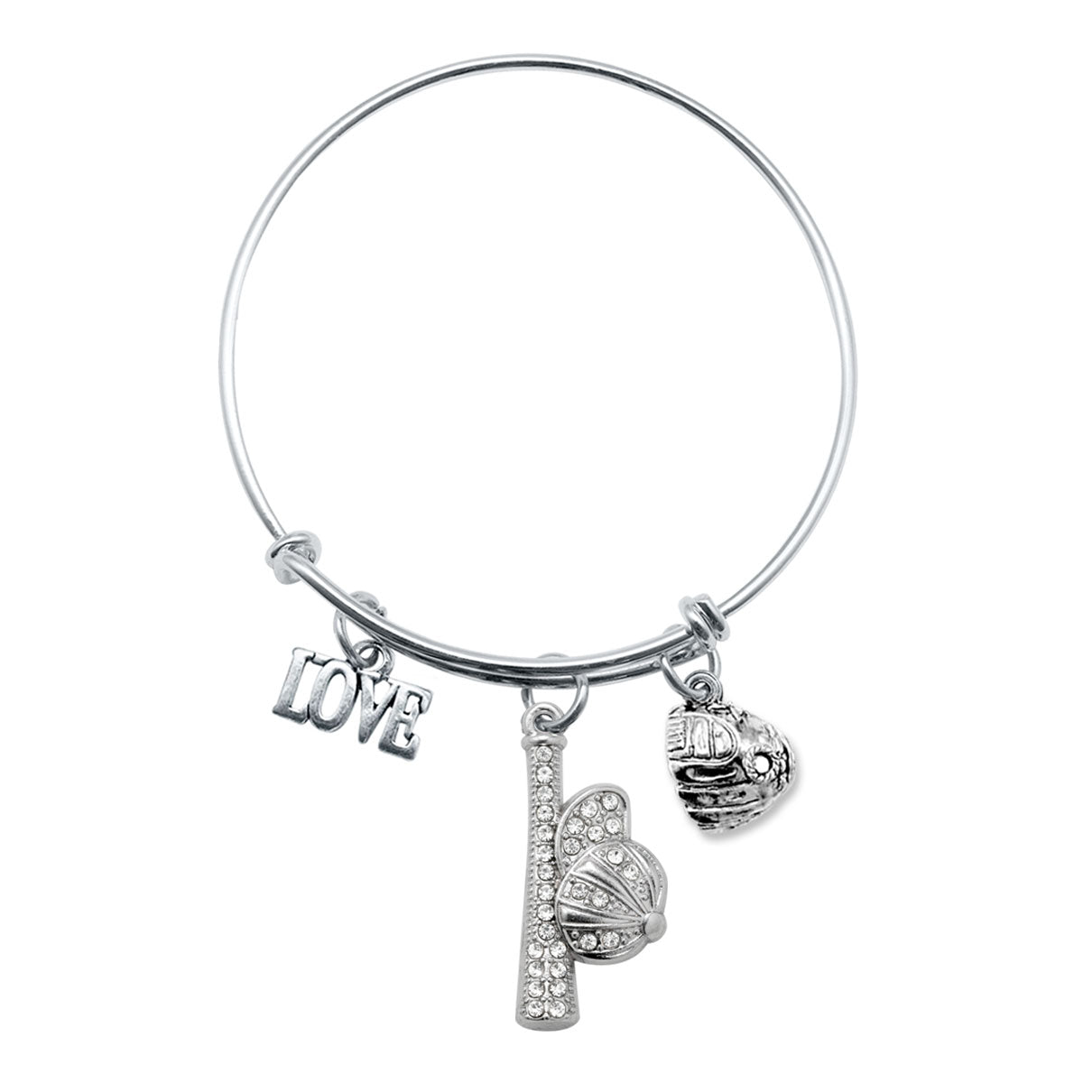 Our sparkling wire bangle bracelet, equipped with the Love Hat and Bat charm, is crafted from white metal with a silver plated finish.
